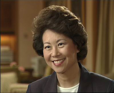 趙小蘭:我認為這些向我襲來的喜悅,興奮和擁戴之情主要是由于我是第一個具有亞洲血統的人被任命為美國總統內閣成員,這在美國歷史上從未有過,所以我想這就是他們為什么這么高興的原因,同時,我的任命也表明任何膚色和種族的人在美國都有成功的可能,也許對一些小女孩,在看著我成功的同時,她們的父母會對她們說,如果你足夠努力,做好了充分的準備,如果幸運也能向你展開微笑,那么在這個被稱為美國的偉大國家里,你會成就任何你想成就的事業。