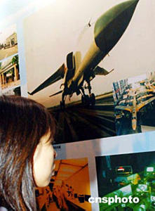 2004西安--香港經濟合作項目推介會,七月二十日在香港會展中心開幕,是次推介會主要以落實中央CEPA安排為契機,充分展示“人文西安--科技西安--現代西安”的新形象與發展前景。圖為推介會舉辦的圖片展上,介紹由西安飛機制造公司總裝的全天候超音速轟炸機“飛豹”。作者:錢興強