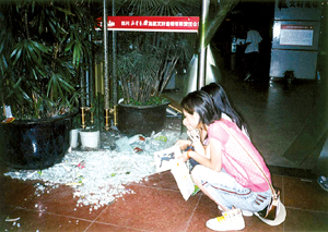 秩序一失控,眾多的歌迷不顧一切地往書城里面擁,而保安則用盡全力往外推-----突然驚叫聲連連,原來書城高大的玻璃門竟然被擠碎了!據現場的受傷歌迷介紹,當時玻璃碎片、渣滓從天而降,一個女歌迷的臉被推擠在被血染紅的玻璃尖刺上無法動彈!書城工作人員連忙打120叫來了急救車,把受傷的女歌迷送到了四川省人民醫院急診室。記者在現場看到其中一個女孩的后頸處有一道約5厘米長的血口,另一個女孩則腳淌鮮血,一瘸一拐地走來;她們原本被送到體育醫院,但因為要縫針才被轉送到省醫院來的。