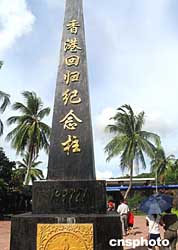 二○○四年七月下旬,在海南興隆華僑農場的亞洲熱帶風情園里,豎立著兩尊黑色金字的柱子。據悉,它們是香港與澳門回歸紀念柱,這兩尊柱子是該風情園的一大景觀。作者:顧時宏