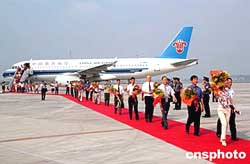 廣州新白云國際機場遷建落成慶典二○○四年八月二日在新機場停機坪舉行。一架空中客車在新機場降落并停在慶典會場,一百二十名新機場的建設者手棒鮮花走下飛機走向會場參加落成慶典。作者:羅仰明