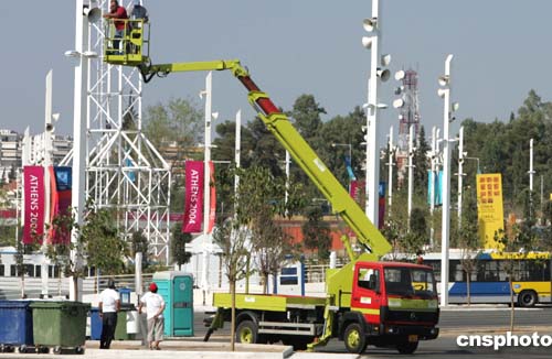 (當(dāng)?shù)貢r(shí)間)二○○四年八月三日,希臘雅典奧運(yùn)會主體育場外的配套工程緊張進(jìn)行,工人們冒著烈日安裝擴(kuò)音設(shè)施。中新社記者:任晨鳴