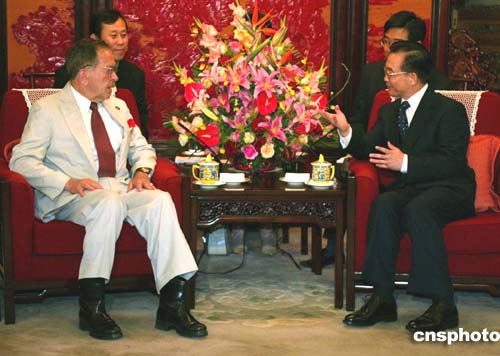 國務院總理溫家寶八月四日在北京會見美國參議院臨時議長特德·史蒂文斯。中新社記者:滿會喬