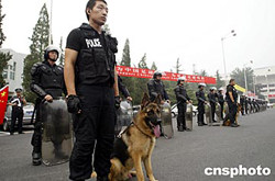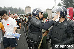 8月7日,在亞洲杯決賽中國隊對日本隊的比賽開賽之前,大批的防爆警察進(jìn)駐北京工人體育場,確保賽場的安全。圖為一名防爆警察為同伴擦汗。中新社記者:盛佳鵬