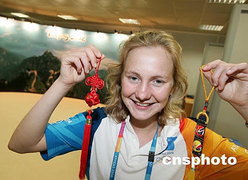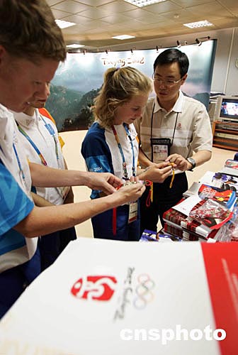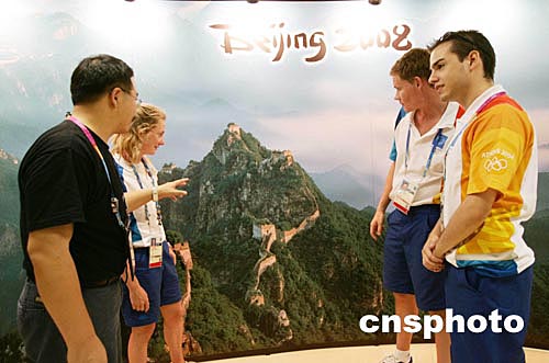 (當地時間)二○○四年八月八日,2008北京奧運會組委會在希臘雅典奧運會新聞中心設立展臺,宣傳北京奧運以及新北京的面貌。中新社記者:毛建軍