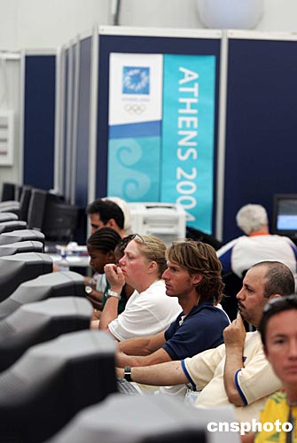 當地時間八月八日,參加雅典奧運會的選手上網娛樂。中新社記者:毛建軍