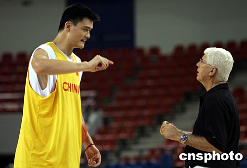 將要在開幕式上擔任中國代表團旗手的姚明在訓練中與主教練交流。作者:任晨鳴