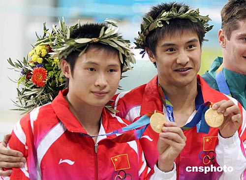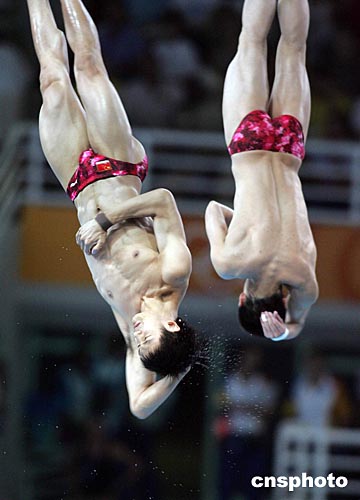 當地時間八月十四日晚,中國跳水隊田亮、楊景輝在雅典奧運跳水館獲得男子雙人十米跳臺金牌。中新社記者:毛建軍
