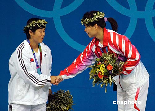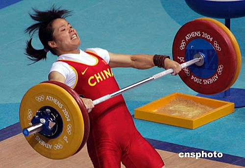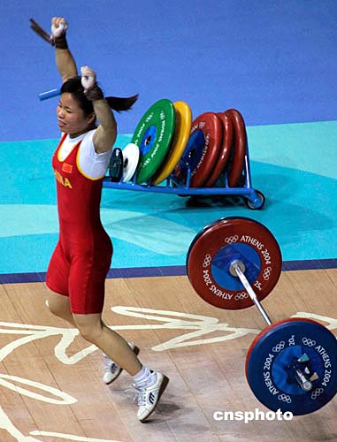 當?shù)貢r間8月16日下午,中國女子舉重名將陳艷青在雅典奧運女子58公斤級舉重比賽中獲得冠軍,為中國代表團奪得第七枚金牌。作者:張煒