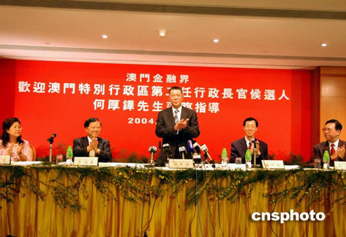 十八日,澳門特別行政區第二任行政長官候選人何厚鏵在中銀大廈與澳門銀行公會、澳門保險公會等金融界代表會晤,聽取他們對未來五年澳門金融業發展的意見。中新社記者:梁永強