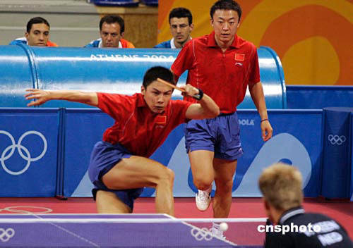 雅典時間八月十八日上午,中國乒乓球男雙搭檔馬琳、陳杞以中4:2戰(zhàn)勝荷蘭選手凱恩、赫斯特爾,晉級奧運男雙8強。中新社記者:張煒