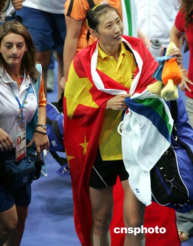 張寧獲勝后扔掉球拍,撲到場外和總教練李永波、女單教練唐學華緊緊地抱在一起,近幾天頗為郁悶的李永波臉上終于重現笑容。
