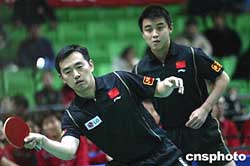 圖為中國乒乓球隊員孔令輝、王浩在義賽比賽中。作者:盛佳鵬