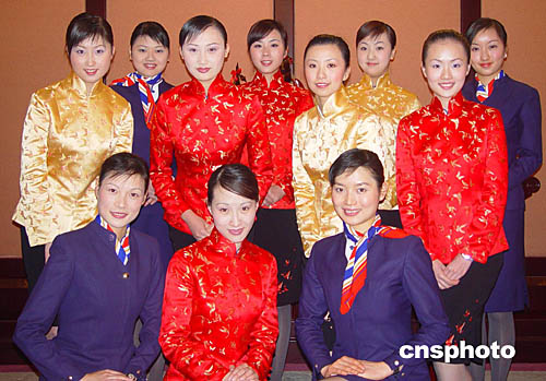 二○○五年兩岸臺商春節包機事宜剛達成共識,十七日,中國東方航空公司向外界透露,東航臺商春節包機航班上的乘務員將身著唐裝。作者:東航