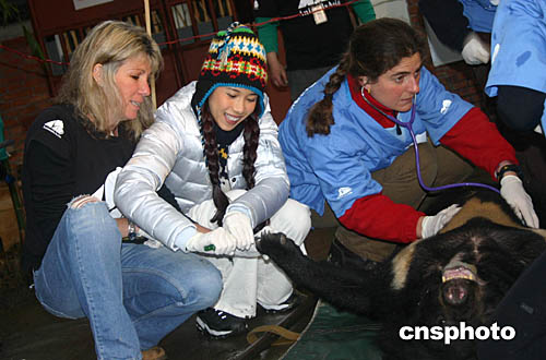 一月二十日,“拯救黑熊”愛心大使、香港藝人莫文蔚再次到訪亞洲動物基金位于成都的黑熊救護中心,正式認養一頭剛被四川省林業廳解救的亞洲黑熊,并為這頭幸運的黑熊命名為“寶貝”。圖為莫文蔚(中)與亞洲動物基金創辦人及行政總監謝羅便臣女士(左一)一起為這頭黑熊做身體檢查。作者:魯彥