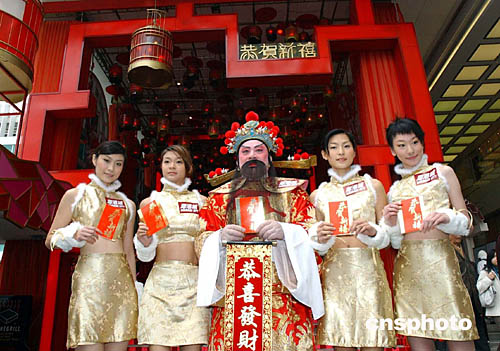 財神爺與亮麗的旗袍美女在海港城向途人派發賀年利是