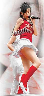 新明日報報道,昨天下午王心凌在西門町舉行《Honey》簽唱會,展現(xiàn)美少女超人氣,現(xiàn)場擠滿上千男女老幼的歌迷,人手一張專輯和心形氣球,她開心地賣力扭腰跳舞,黑白條紋迷你裙不時裙擺飛揚,露出里面紅色的安全小褲褲。