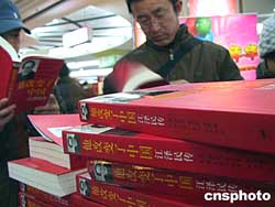 美國人羅伯特.勞倫斯.庫恩博士所著的《他改變了中國:江澤民傳》,春節之前一面市便受到廣大書友的追捧。圖為2月17日北京西單圖書大廈內幾位讀者正在聚精會神地看書。作者:納夢月