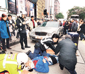 袁潔瑩昨晨十一時許,駕駛銀色平治房車沿漆咸道南向尖沙咀行駛,途至金馬倫道對開交通燈位時,一名五十二歲菲籍女子突然由行人路道走出欲過馬路,Fennie剎車不及將對方撞倒地上,她立即停車報警。
