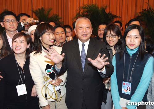 全國政協十屆三次會議三月十二日下午閉幕后,新當選的全國政協副主席董建華在北京政協禮堂舉行新聞發布會,并與現場采訪的香港記者們合影。作者:毛建軍