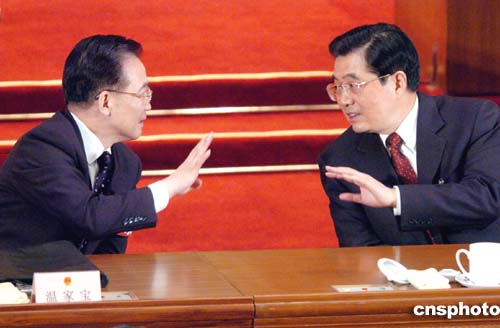 三月十三日上午,十屆全國人大三次會(huì)議第四次全體大會(huì)在北京人民大會(huì)堂舉行,人大代表投票選舉中華人民共和國中央軍事委員會(huì)主席。圖為胡錦濤與溫家寶在主席臺(tái)上交談。作者:陳文