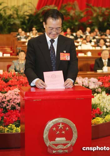 十屆全國人大三次會議第四次大會三月十三日在北京人民大會堂舉行,胡錦濤在會上當選為中華人民共和國中央軍事委員會主席。圖為國務院總理溫家寶投票。作者:毛建軍