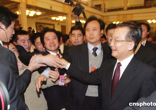 十屆全國人大三次會議三月十四日在北京人民大會堂閉幕,國務院總理溫家寶在閉幕會后舉行記者會。圖為溫總理在記者招待會結束后走到記者席前,與現場采訪的中外記者握手。作者:毛建軍