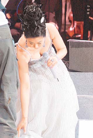 而沙麗則以高貴宮廷貴婦造型亮相,她身穿性感的白色低胸吊帶裙,披了小外套,襯以高髻發型,并佩戴閃令令的鉆石耳環及戒指,貴氣十足,但沙麗自嘲發型似菠蘿頭.之后沙麗問歌迷介不介意她脫去外套?然后指揮家便替沙麗除去外套,沙麗說:“今晚不跳舞,不會有危險.今晚我買了保險,如果像我老公一樣跌傷也會有錢賠。”