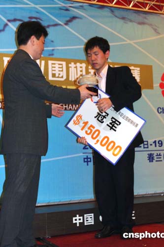 在3月18日下午結(jié)束的第五屆春蘭杯世界圍棋錦標(biāo)賽決賽決勝局的比賽中,有韓國(guó)“石佛”之稱的李昌鎬(右)中盤擊敗周鶴洋,蟬聯(lián)春蘭杯冠軍。圖為李昌鎬在接受15萬(wàn)美元的獎(jiǎng)金以及其它獎(jiǎng)品。作者:劉雙雙