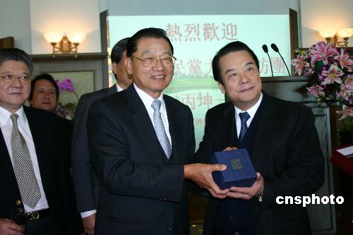 中國國民黨副主席江丙坤一行三十日中午在南京會見江蘇臺商。他表示,臺商在江蘇得到最好的照顧,他們的事業(yè)大部分都相當的成功。臺商在這里的發(fā)展對大陸的經濟發(fā)展也有相當大的貢獻。但是,兩岸人民不但祈求經濟的繁榮,更希望兩岸的和平,因為兩岸的和平才能帶來兩岸的繁榮。圖為江丙坤向江蘇臺商贈送禮品。作者:陳旻