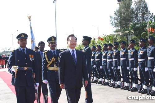 中國國務(wù)院總理溫家寶今天下午抵達(dá)斯里蘭卡首都科倫坡,圖為溫家寶檢閱斯里蘭卡儀仗隊(duì)。作者:齊彬