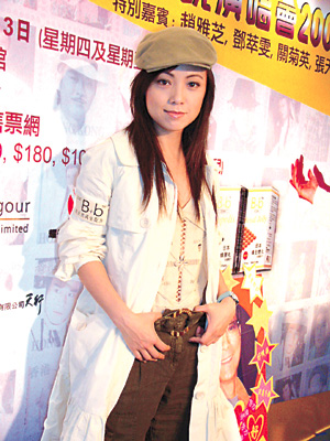 至于唱歌、跳舞及演戲,她覺得自己哪一方面最難控制?她不諱言是跳舞,因為跳舞之余又要顧演戲及漂亮樣,所以她已要求服裝設計以安全為主,因為紅館四方八面都是觀眾。問到安全之余會否是低胸?她笑道:“低胸也沒有驚喜啦!總之我的宗旨是視覺上可觀但又絕對安全。”她又說四位嘉賓中,以她最貪玩,所以如果大家要看她奔放,就不要太少布。