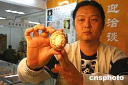 四月十四日,二○○五中國國內(nèi)旅游交易會(huì)在廣西桂林開幕。廣西民間藝術(shù)家陳樺鳴攜“蛋琢”繪畫藝術(shù)亮相“旅交會(huì)”。陳樺鳴的蛋琢繪畫曾獲廣西特色旅游工藝品設(shè)計(jì)大賽銀獎(jiǎng)。圖為陳樺鳴在向游客展示雕琢有毛澤東頭像的“蛋琢”繪畫品。作者:蔣雪林