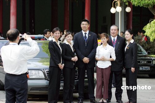 連戰的長子連勝文(右四)四月二十七日在南京參觀中國近代史遺址博物館時,與臺灣著名藝人、亞洲影帝柯俊雄(右二)以及當地的導游小姐們一起合影。作者:毛建軍
