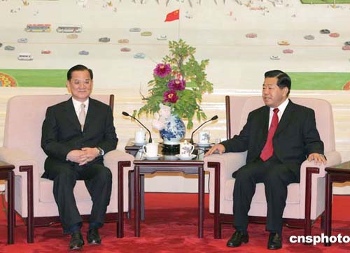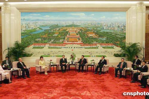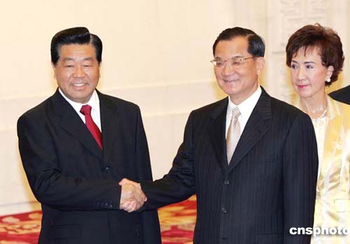 中新網4月28日電 中共中央政治局常委、全國政協主席賈慶林今日(28日)17時30分左右,在人民大會堂會見了連戰率領的中國國民黨大陸訪問團一行。