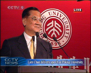 連戰在演講開始時說,今天我和內人偕同中國國民黨大陸訪問團一起來到北京大學,非常榮幸,也非常溫馨。剛才我了解到北京大學就是當年燕京的校址,我的母親(上世紀)三十年代在這里念書,所以今天來到這里可以說是倍感親切。