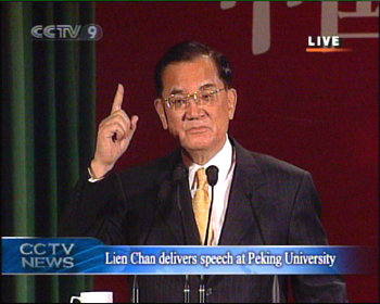 連戰(zhàn)說,我這一次到大陸來訪問,我說“來的不易”,因為有若干的人很遲疑,甚至于有一種批判,認為我到這里來,是為了進行所謂“第三次的國共和談”,所以我的目的是要“聯(lián)共制臺”,那個“臺”下面還是有個“獨”字。