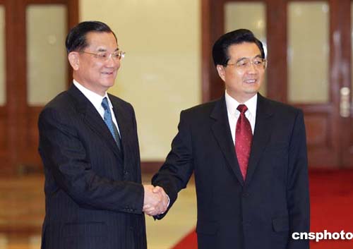 中共中央總書記胡錦濤在北京人民大會堂與中國國民黨主席連戰會面,實現了兩黨最高領導人相隔60年后的歷史性握手。