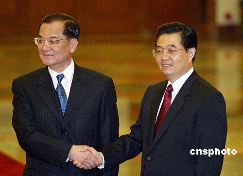 四月二十九日,中共中央總書記胡錦濤在北京人民大會堂會見中國國民黨主席連戰。作者:廖文靜