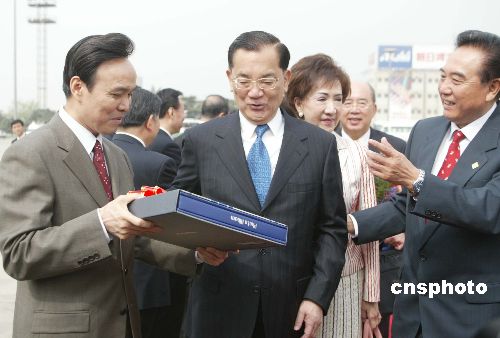 四月三十日,中國國民黨主席連戰結束北京之行啟程前往西安,中共中央臺辦主任陳云林、北京市委副書記龍新民在機場為其送行。圖為連戰獲贈北京之行紀念像冊分外驚喜。作者:廖文靜