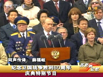 5月9日,俄羅斯在莫斯科紅場舉行紀(jì)念衛(wèi)國戰(zhàn)爭勝利60周年慶典。圖為俄羅斯總統(tǒng)普京發(fā)表講話。(央視截圖)