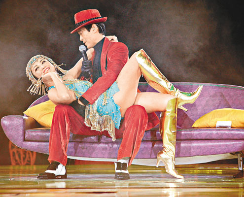 之后秋官站在一個離地約十多呎的凌空舞臺上唱歌,為安全起見,他全程扶實欄桿,接著雯女亦以金色如妃Look出現,但兩人的頭飾一度勾住,秋官即搞笑說:“如妃一出就勾勾搭搭,搞到臺下老百姓大叫!”雯女獨唱一曲《似是故人來》后更即場除去外面的古裝,原來內里穿了一條低胸超短裙,十分性感,更和秋官跳辣身舞,更伸手摸秋官胸部及坐大腿。