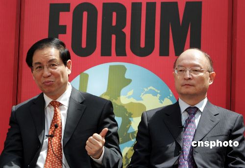 2005北京《財富》全球論壇5月18日專門舉行“中國銀行業改革近況”會議,中國銀監會主席劉明康(左)、國家開發銀行行長陳元用嫻熟的英語坦誠地與世界各國業界人士對話。作者:任晨鳴