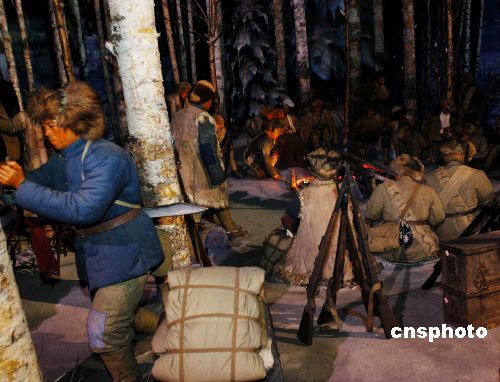 圖:東北抗日聯軍在深山老林艱苦抗戰的場景再現