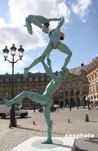 女藝術家安娜施羅米的一組名為“歐洲神話”的雕塑,目前正在巴黎極富盛名的旺多姆廣場展出。展覽引用一句名言“只有美能拯救世界”。圖為展覽中最為高大的雕塑作品,題為“奧林匹克精神:挑戰”。據主辦者稱,這件作品擬贈給中國,為2008年奧運會增色。作者:鐘誠