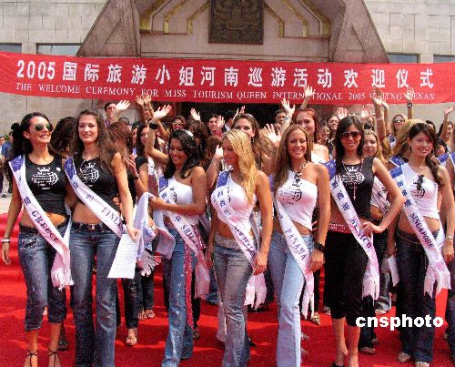 “二OO五國際旅游小姐中國之旅”河南巡游團暢游中原之行,六月十一日上午在鄭州正式“起程”,河南省政府在河南博物院廣場舉行儀式,歡迎佳麗們的到來。該團由七十五個國家和地區(qū)的七十五名旅游形象大使和二十多個境內外媒體組成,從當日起,七十五名旅游大使的“美麗”腳步將暢游錦繡中原,感受黃河風情,體驗中國古老燦爛歷史。圖為“起程”儀式。作者:胡珂