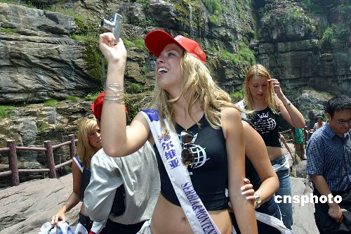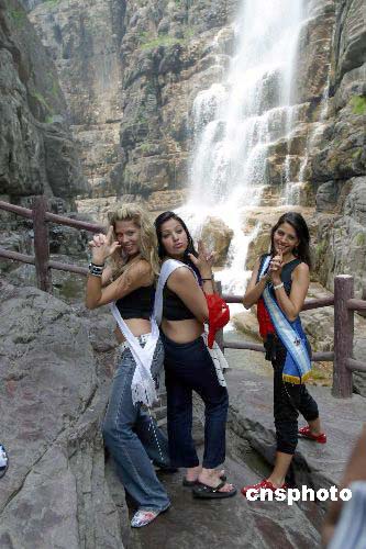 六月十四日,國際旅游小姐大賽參賽佳麗在云臺山天瀑下留影。國際環球旅游小姐河南巡游行最后一站在河南焦作云臺山世界地質公園,云臺山園區是中國國家森林公園,世界地質公園,山勢險峻、溝壑縱橫、常年云纏霧繞。擁有紅石峽、泉瀑峽、云臺天瀑、潭瀑峽、情人瀑等具有世界地質特征的重要景點。