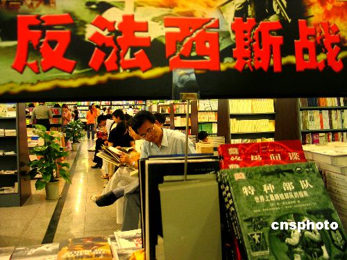 6月18日,南京某書城為紀念中國抗日戰爭暨世界反法西斯戰爭勝利60周年,在店堂內設立了反法西斯戰爭主題書展,受到讀者歡迎,每天都吸引百余位讀者。作者:鐘山
