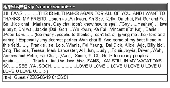 其實自Sammi接拍《長恨歌》以來,關于其身體及精神狀況的傳聞一直沒完沒了,曾志偉早前透露梅艷芳的逝世對她打擊很大,更有意退出娛樂圈。不過,Sammi為安撫歌迷,曾化名“Mi”以英文在網上留言,表示自己身體很好。剛過去的星期天,她更兩度在網上留言,除了祝愿天下父親“父親節快樂”外,更于凌晨時分留言答謝一眾好友,當中包括安仔、古天樂、古巨基、陳慧琳及劉德華等,可見Sammi與安仔關系依然要好。