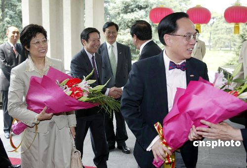 自動當選并獲中央政府任命的香港特別行政區行政長官曾蔭權(右一)和夫人、前往機場迎接的國務院港澳辦副主任陳佐洱(左三),六月二十三日中午抵達北京釣魚臺國賓館。曾蔭權將于二十四日參加在人民大會堂舉行的宣誓就職儀式。作者:盛佳鵬